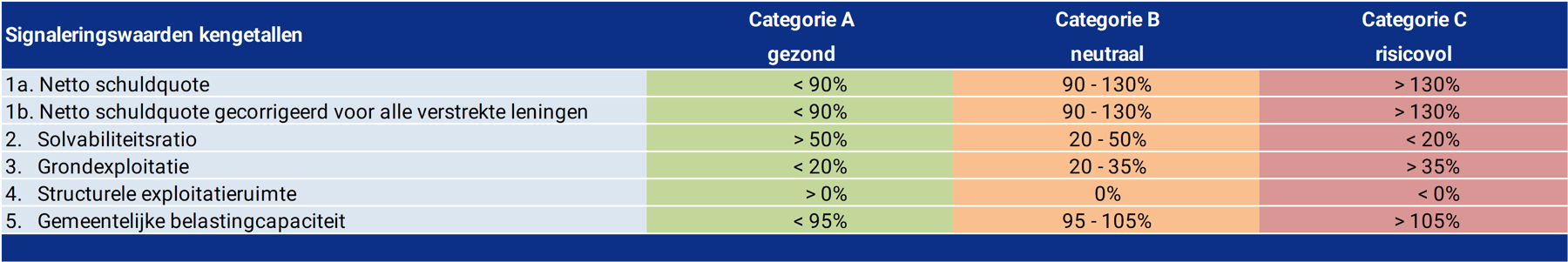 De kengetallen lichten de schuldquote, solvabiliteit, grondexploitatie, structurele exploitatieruimte en gemeentelijke belastingcapaciteit toe. De kengetallen zoals die uniform voor de gemeenten zijn voorgeschreven bestrijken ieder een eigen gebied. Hieronder zijn de verschillende kengetallen opgenomen en wordt de eigenheid daarvan beschreven. Ook wordt de onderlinge samenhang toegelicht.