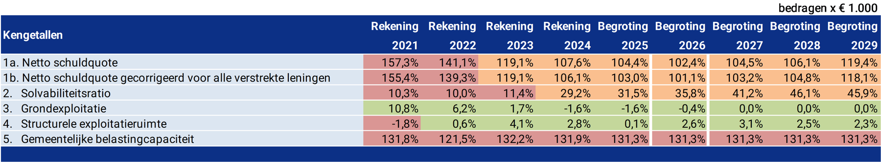 In deze samenvattende tabel worden de uitkomsten van de verschillende kengetallen in één tabel weergegeven. Daarbij is tevens de kleurwaardering “rood, oranje, groen” weergegeven zodat de lezer in één oogopslag een beeld heeft van de financiële positie van de gemeente. De conclusie kan niet anders luiden dan dat deze nog steeds als ‘risicovol’ te betitelen is. Tegelijkertijd zien we dat de maatregelen vanuit het herstelplan een positief effect hebben gehad op het terugdringen van de schuldpositie. Door de te verwachte investeringen in de komende jaren zien we de netto schuldquote vanaf 2027 door de geplande investering in het onderwijs weer oploopt.