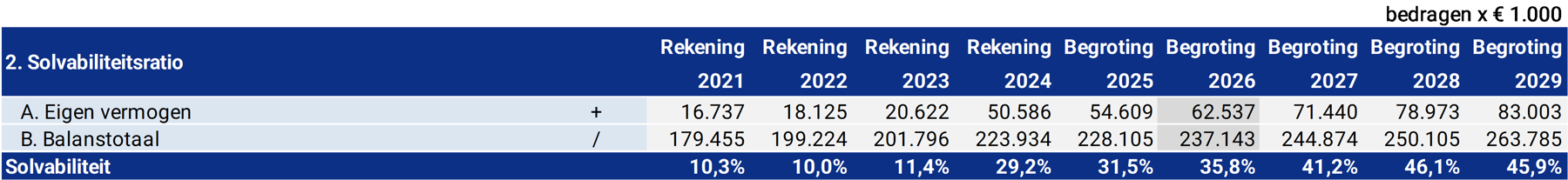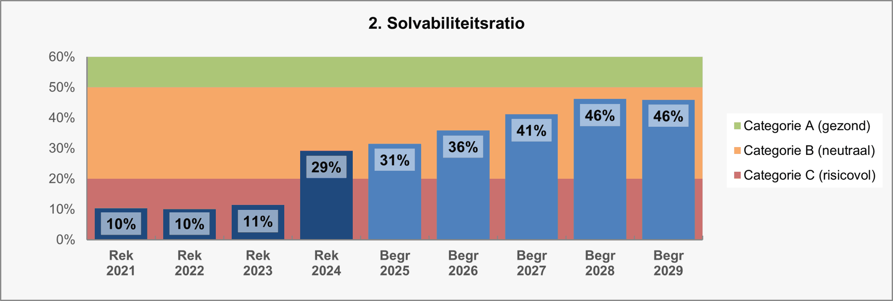 De solvabiliteitsratio geeft aan in hoeverre het gemeentelijk bezit niet met schuld belast is. Dit ratio geeft de ontwikkeling van het eigen vermogen weer. Door de beperkte vermogenspositie van de gemeente scoorden we de tot 2023 niet goed en dus ‘rood’. Vanaf 2024 is duidelijk de inzet van de inspanningen om te komen tot een herstel van de financiële positie te zien en is de ratio opgelopen van 10% naar 29%. Daarmee scoren we vanaf 2024 ‘oranje’, maar is de trend naar een gezonde financiële positie duidelijk ingezet.
