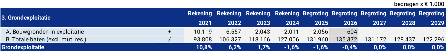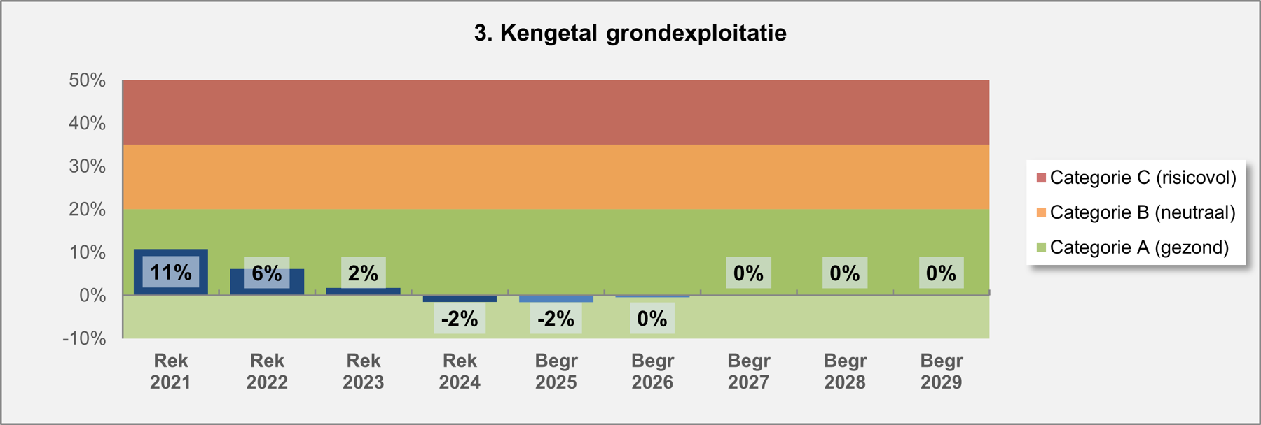 Het kengetal grondexploitatie geeft aan in welke mate de voorraad grondexploitaties van invloed is op de begroting. Hoe hoger dit percentage is, des te afhankelijker is de gemeente van de grondexploitaties. Doordat wij relatief weinig bouwgronden in exploitatie meer hebben, is de afhankelijkheid zeer beperkt te noemen.