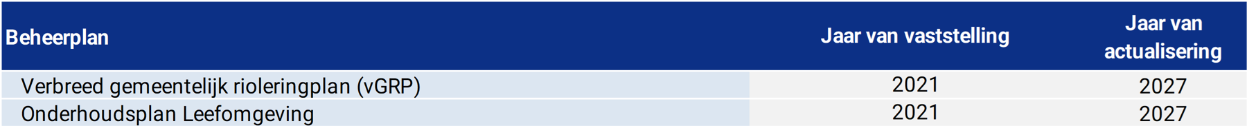 Het bestaande beleid voor het onderhoud van de kapitaalgoederen is vastgelegd in twee beleids- en beheerplannen. Dit zijn (1) het Verbreed gemeentelijke rioleringsplan (GRP) en (2) het Onderhoudsplan Leefomgeving. Deze plannen zijn allebei in 2021 vastgesteld en worden ook allebei in 2027 geactualiseerd.