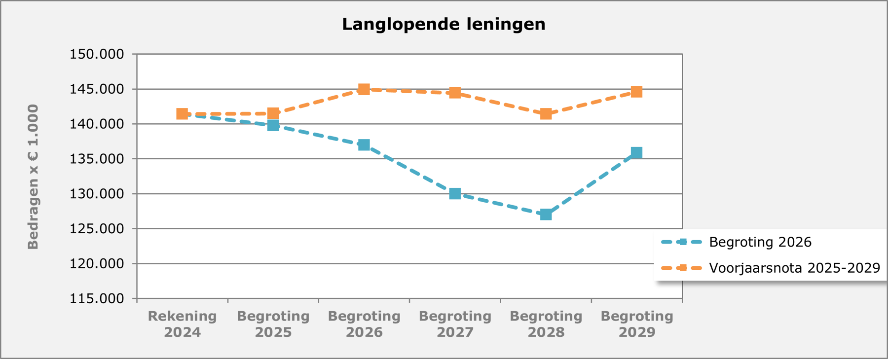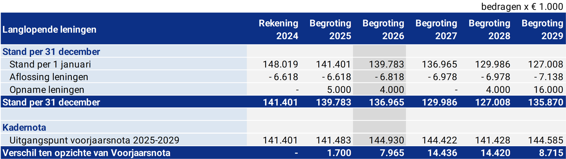 De samenstelling van de leningenportefeuille blijkt uit de staat ‘geldleningen’, opgenomen in de bijlagen. Voor alle leningen geldt dat gehele of gedeeltelijke vervroegde aflossing gedurende de looptijd van de lening niet is toegestaan. Ook geldt dat alle leningen gedurende de gehele looptijd rentevast zijn. Gelet op de huidige stand van de liquide middelen wordt voor de komende jaren beperkte nieuwe geldleningen voorzien. Hierbij moet worden opgemerkt dat het hier om de financieel technische doorrekening gaat. In hoeverre in de jaren daadwerkelijk tot het aantrekken van een langlopende geldlening wordt overgegaan, wordt op dat moment beoordeeld. Samengevat geeft dit het volgende beeld: