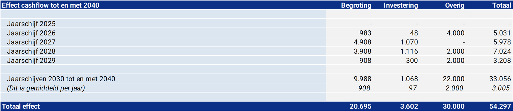 Onderstaand vindt u een overzicht van de gevolgen van de diverse ombuigingen op de cashflow tot en met 2040. Dit heeft een directe invloed op de schuldenpositie. Dit is goed te zien in de grafiek die u kunt vinden in de aanbiedingsbrief onder 'liquiditeitspositie'.