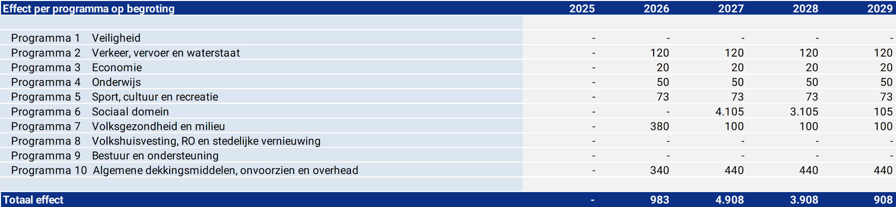Onderstaand ziet u een overzicht van de effecten van de voorgestelde ombuigingen op programmaniveau voor de periode van deze meerjarenbegroting.