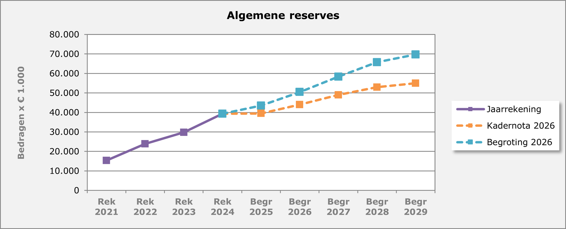 De tweede invalshoek geeft de hoogte van het bedrag van de algemene reserves weer waarover de gemeente beschikt. De bestemmingsreserves worden in dit overzicht buiten beschouwing gelaten omdat de bestemming daarvan in beginsel vast ligt en dus, zonder specifiek raadsbesluit, niet algemeen inzetbaar is. De financiële middelen uit de algemene reserves kunnen ingezet worden om incidentele uitgaven te bekostigen, een negatief rekeningresultaat op te vangen of worden gebruikt om een bedrag beschikbaar te stellen voor een specifieke voorziening. De omvang van de reserves bepaalt in hoeverre de gemeente in staat is risico’s op te vangen en is bepalend voor de beoordeling of de omvang voldoende is om te spreken van een financieel verantwoord weerstandsvermogen. In de paragraaf weerstandsvermogen wordt uitgebreid op dit onderwerp ingegaan. Het verloop van de algemene reserve laat zich als volgt schetsen: