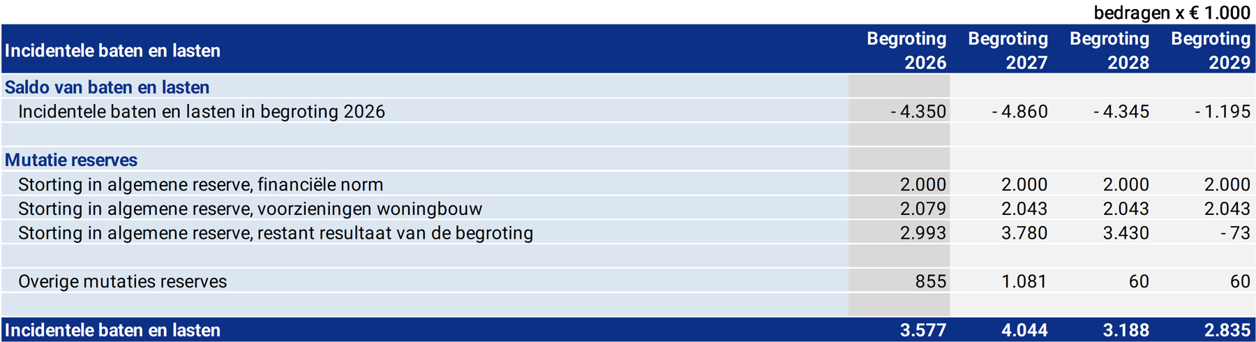 De incidentele baten en lasten zijn als volgt te specificeren.