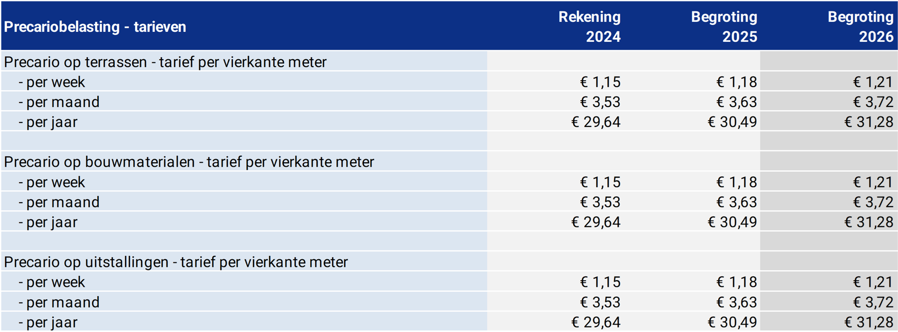 Voorgesteld wordt om de tarieven voor de precariobelasting met alleen de inflatiecorrectie van 2,6% te verhogen. Vergelijking van de tarieven voor 2026 met die van de twee voorgaande jaren, geeft dan het volgende beeld: