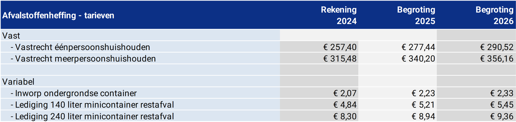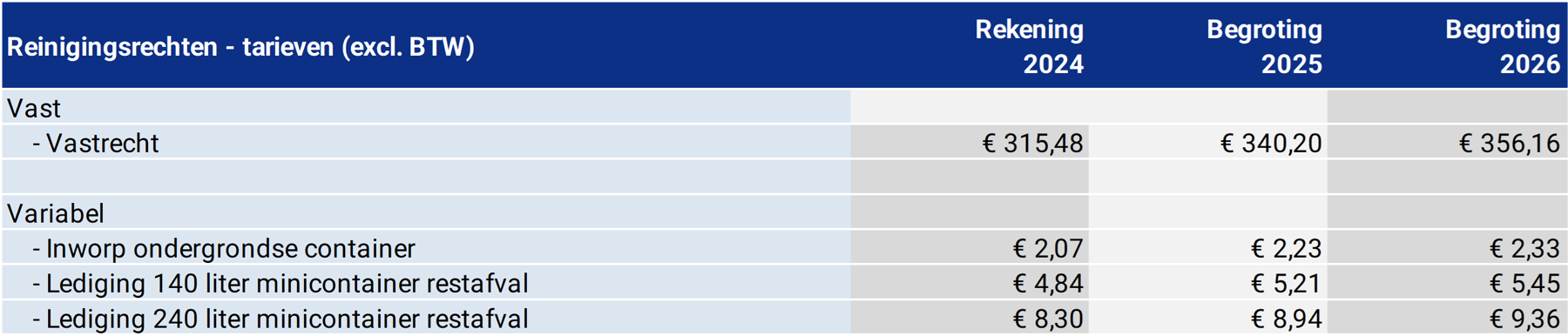 Voorgesteld wordt om de opbrengst van de reinigingsheffingen met de algemene inflatiecorrectie van 2,6% te verhogen. Daarnaast is bij het vaststellen van de begroting 2025 ook besloten om de kostendekkendheid in 2026 naar 95% te brengen en in 2027 naar 100%. Het college stelt in deze begroting voor om de groei te temporiseren, in 2026 naar 92%, in 2027 naar 96% en in 2028 naar 100%. Voor de verhoging van de kostendekkendheid in 2026 naar 92% moet nog een extra verhoging van de tarieven worden doorgevoerd van 2,1%. Per saldo stijgen de tarieven voor de reinigingsheffingen dan met 4,7%.