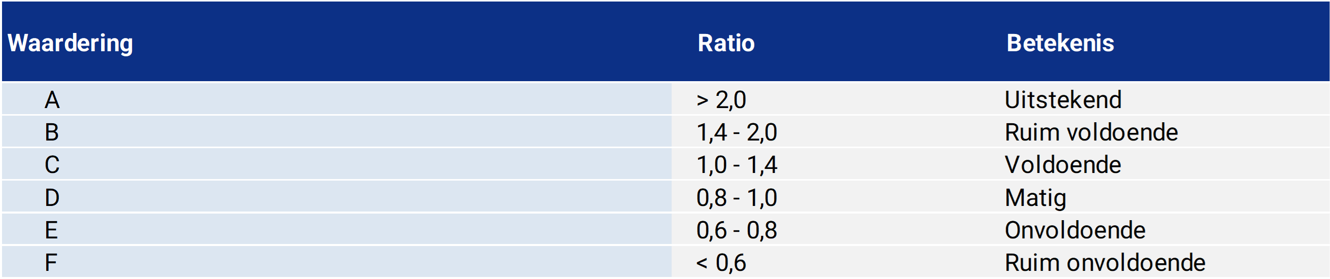 Voor de beoordeling van de ratio’s wordt gebruik gemaakt van de waarderingstabel die door de NAR in samenwerking met de Universiteit van Twente is ontwikkeld.