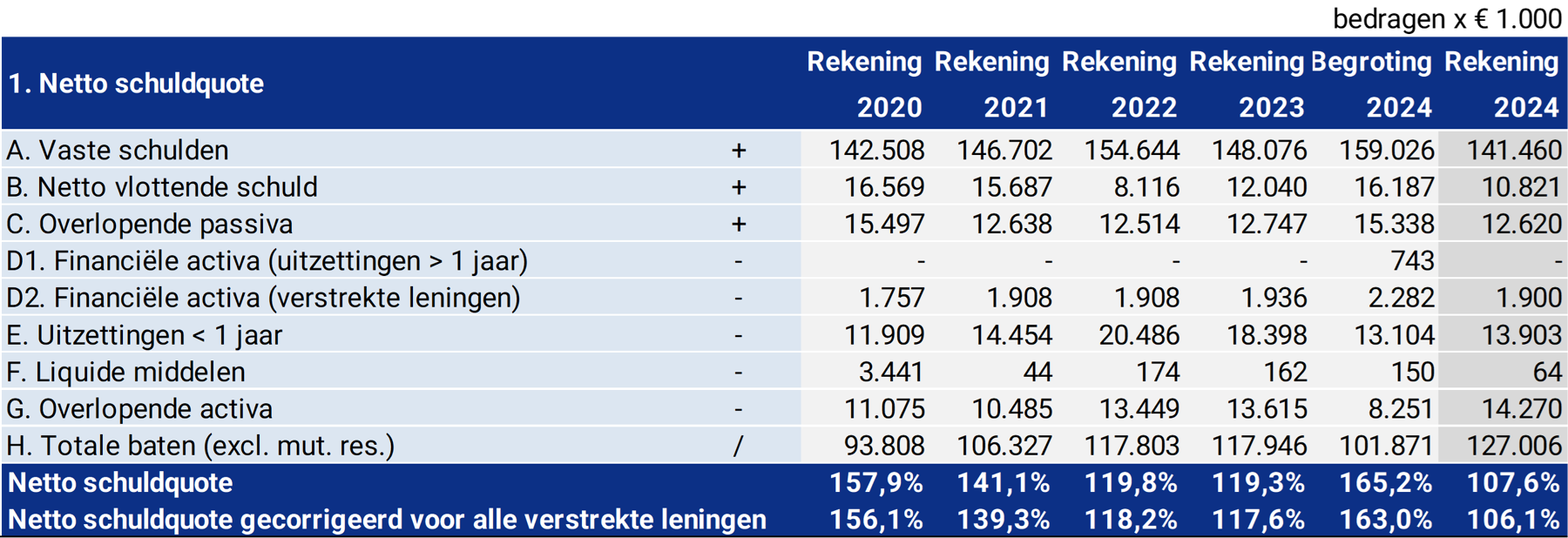 De netto schuld quote is met afstand de meest bekende en geeft aan hoe de netto schuld van de gemeente zich verhoudt tot de jaarlijkse baten. Anders gezegd: Kan met het jaarlijks inkomen de schuld worden gedragen? Door de VNG is hiervan gezegd dat gemeenten met een quote van 130% of meer zich in de gevarenzone bevinden.
