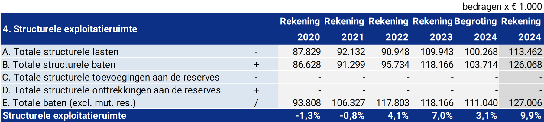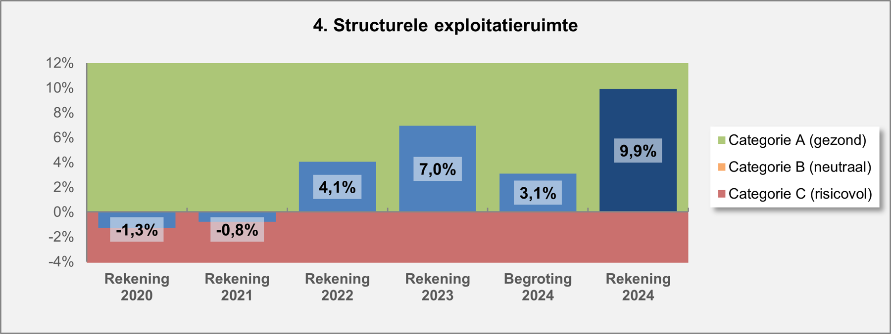 De structurele exploitatieruimte geeft aan welk gedeelte van de totale exploitatiebaten in beginsel vrij beschikbaar is. Dit percentage dient altijd positief te zijn. Hoe groter het percentage hoe meer ruimte er is voor zaken als “terugdringen schuldpositie”, “nieuw beleid”, etc. Er is in 2024 sprake van een positieve structurele exploitatieruimte. Ook dit in terug te leiden naar onze inspanningen tot verbetering van de financiële positie van onze gemeente. Deze exploitatieruimte biedt namelijk de mogelijkheid om de schuldenlast van de gemeente verder terug te dringen.