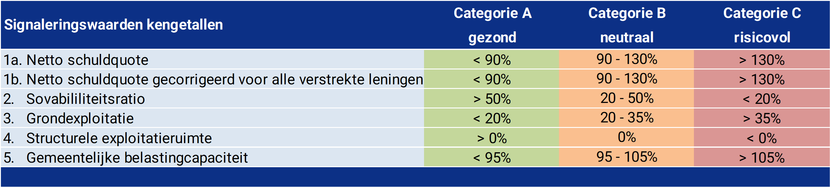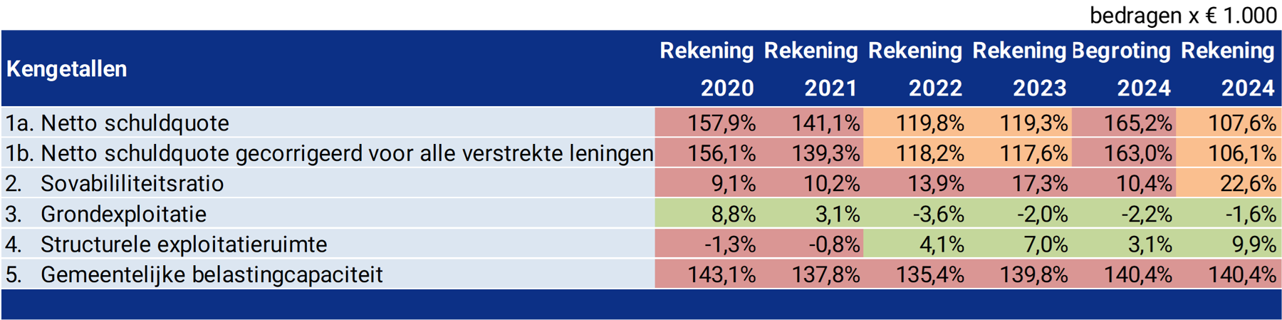 Per kengetal is sprake van een categorisering aan de hand waarvan kan worden afgeleid in hoeverre een gemeente voor wat dat onderdeel betreft al dan niet gezond kan worden genoemd. Deze categorisering is hieronder in één tabel opgenomen. In de hierboven opgenomen grafieken is reeds per kengetal een signalering verwerkt. In zijn algemeenheid luidt dan de conclusie dat de gemeente in financieel opzicht nog steeds niet gezond kan worden genoemd. Toch is duidelijk wel een verbetering waarneembaar. In 2020 en 2021 kleurden vijf van de zes kengetallen rood, terwijl dat in de jaarrekening 2024 nog slechts bij één kengetal het geval is. Ook is binnen een bepaalde kleur stelselmatig verbetering zichtbaar. Wij zien dat duidelijk als een beloning van onze inspanningen om de financiële positie van onze gemeente te verbeteren.