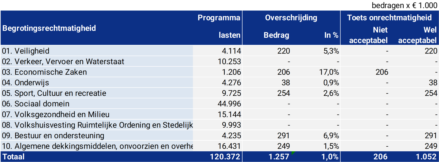 In de realisatie van de baten en lasten en investeringskredieten zijn overschrijdingen van de lasten geconstateerd ter grootte van € 1,41 mln. Vanaf 2023 worden deze overschrijdingen altijd aangemerkt als onrechtmatig. In de onderstaande tabel zijn de geconstateerde overschrijdingen van de lasten op programma-niveau in beeld gebracht inclusief het bedrag wat acceptabel is.