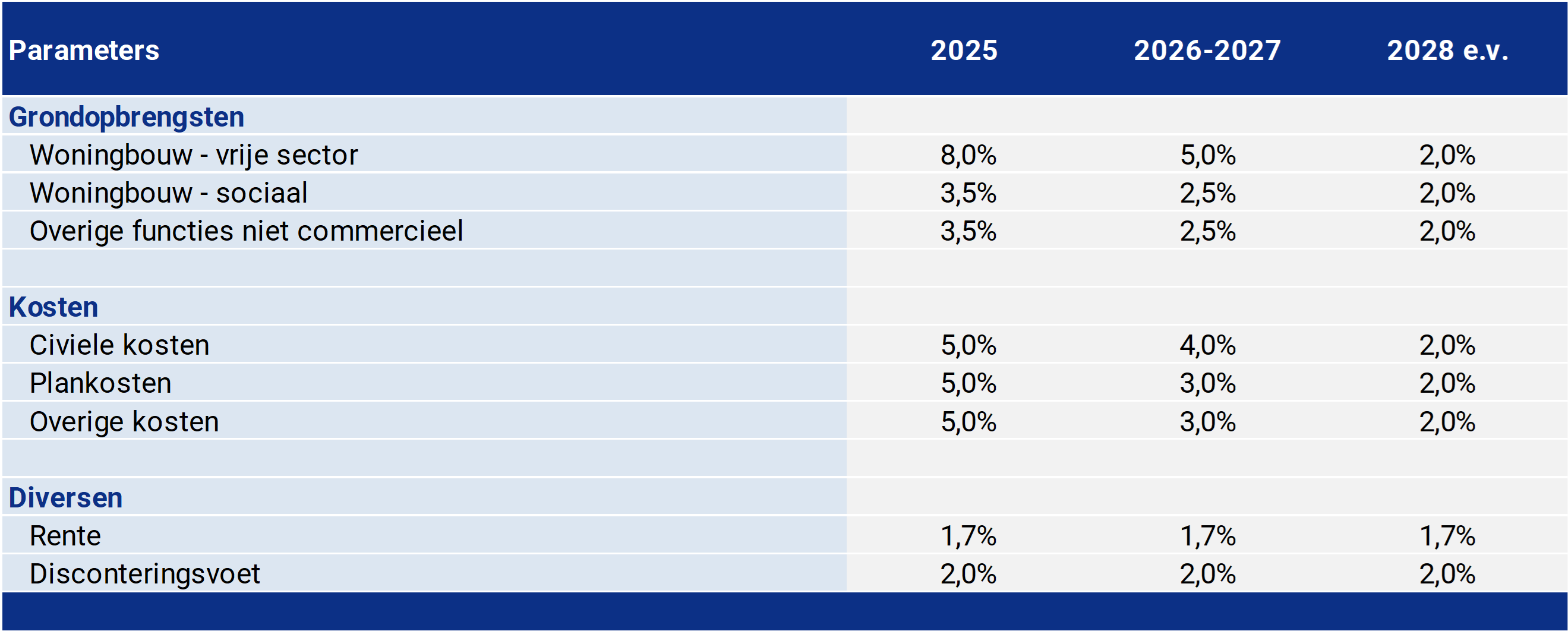 In grondexploitaties wordt gerekend met zogenaamde rente- en inflatieparameters. De parameters zijn bepaald op basis van inflatieontwikkelingen uit oktober-november 2024. Het risico bestaat dat de huidig vastgestelde inflatieparameters niet meer in de pas lopen met de huidige inflatieontwikkelingen. Het scenario van nog sterker stijgende parameters is reeds (deels) verwerkt in de risicoanalyses. Zodra er desondanks nieuwe parameters moeten worden vastgesteld wordt de raad op de hoogte gebracht van de impact hiervan. De renteparameter wordt continue gemonitord of de huidige renteparameter nog gehandhaafd kan worden. Een bandbreedte van 0,5% is toegestaan.