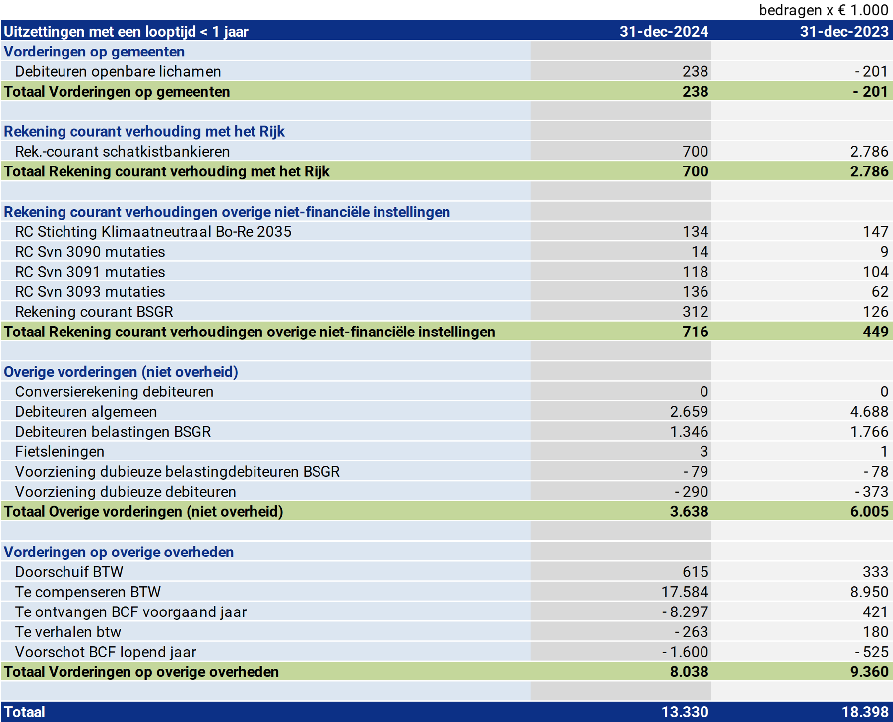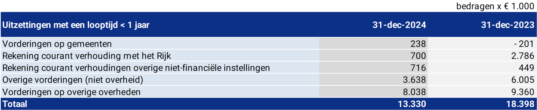 De in de balans opgenomen uitzettingen met een rentetypische looptijd van één jaar of minder kunnen als volgt gespecificeerd worden: