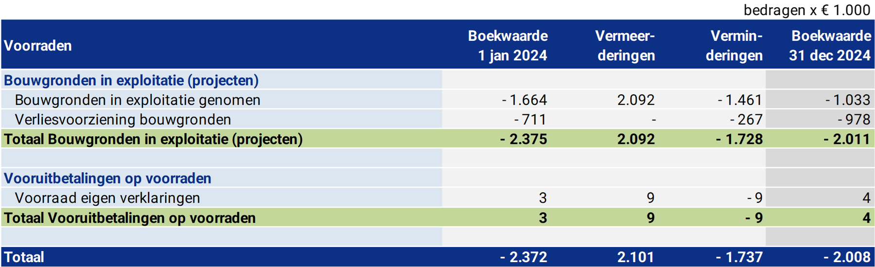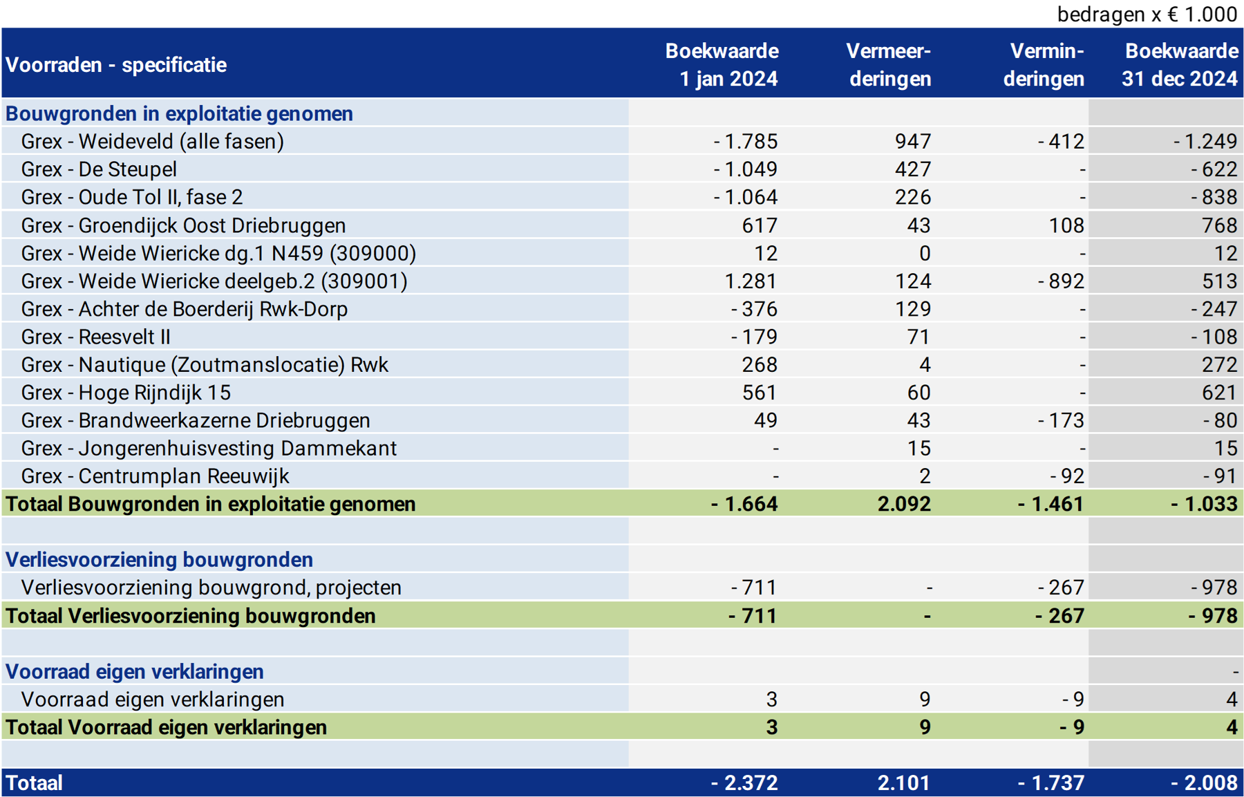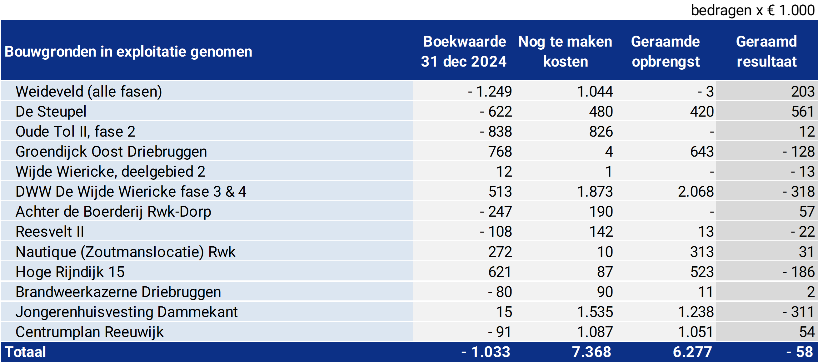 Ten aanzien van de bouwgronden in exploitatie zoals opgenomen in bovenstaande tabel wordt in onderstaande tabel inzicht gegeven in het uiteindelijk te verwachten resultaat van deze grondexploitaties. Uitgangspunt hierbij is de boekwaarde zoals opgenomen in deze jaarrekening. Vervolgens is een inschatting gemaakt van de nog te maken kosten en de nog te verwachten opbrengsten, waarna een geprognosticeerd resultaat per grondexploitatie wordt gepresenteerd. Ten aanzien van de getroffen verliesvoorziening voor grondexploitaties wordt vermeld dat deze voorziening tot en met het jaar 2018 werd gewaardeerd tegen de netto contante waarde. Met ingang van 2019 vindt deze waardering plaats tegen de verwachte eindwaarde. Omdat de omvang van deze voorziening zeer beperkt is, is het effect van deze wijziging verwaarloosbaar.