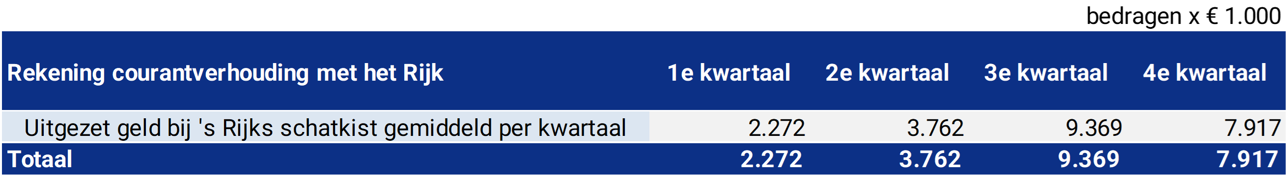 Onderstaande tabel geeft aan welke bedragen gemiddeld ieder kwartaal door de gemeente Bodegraven-Reeuwijk zijn uitgezet bij de schatkist.