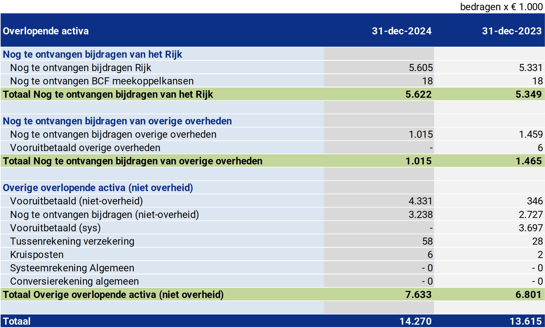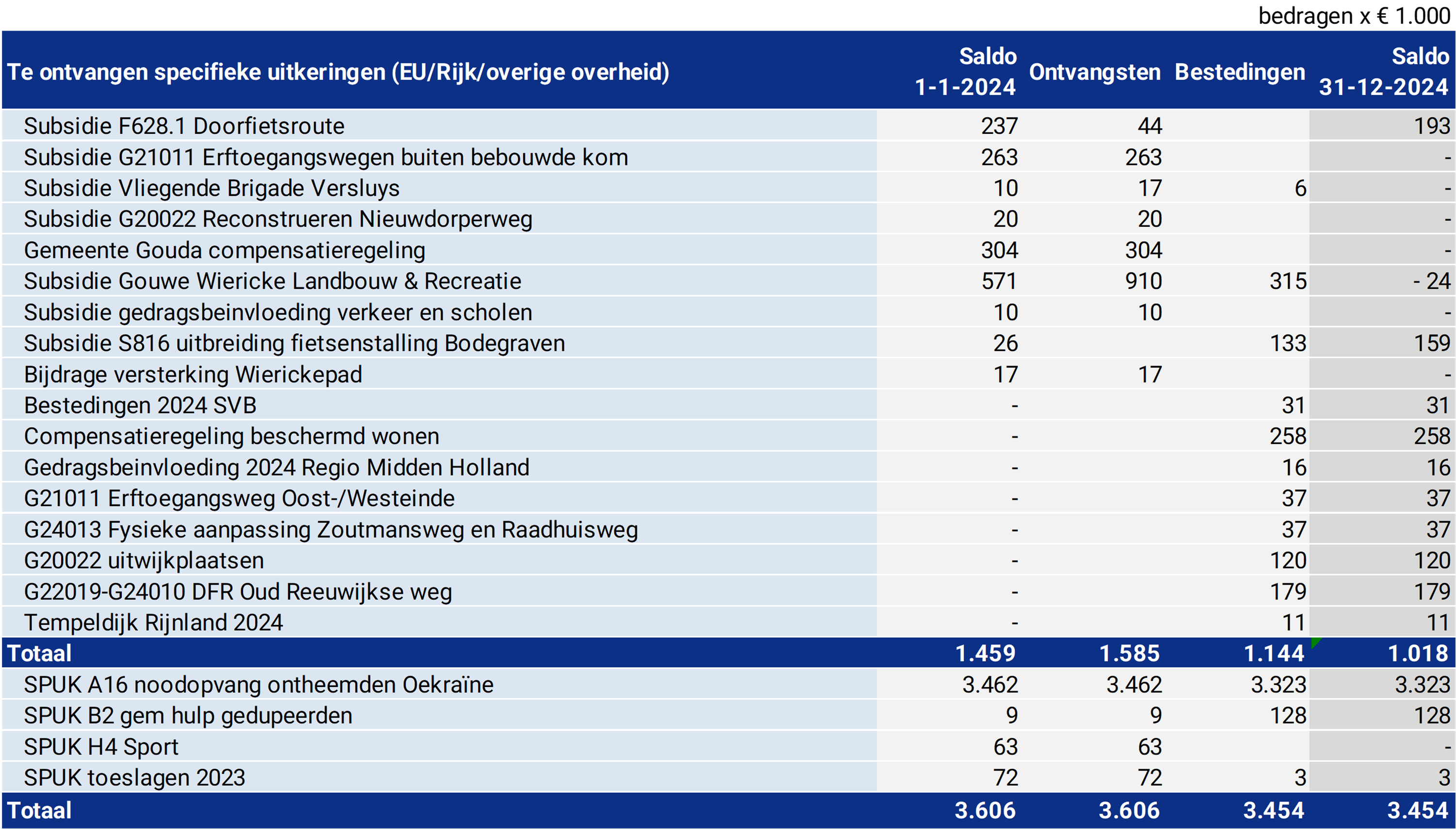 De in de balans opgenomen te ontvangen voorschotbedragen voor uitkeringen met een specifiek bestedingsdoel die dienen ter dekking van lasten van volgende begrotingsjaren, kunnen als volgt worden gespecificeerd:
