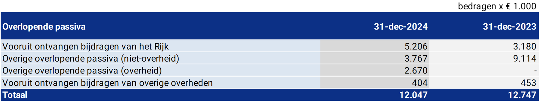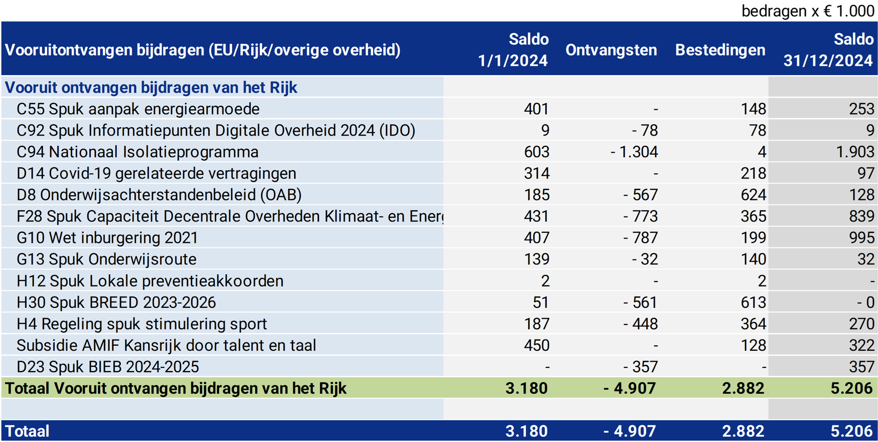 De in de balans opgenomen van Europese en Nederlandse overheidslichamen vooruit ontvangen voorschotbedragen voor uitkeringen met een specifiek bestedingsdoel die dienen ter dekking van lasten van volgende begrotingsjaren, kunnen als volgt worden gespecificeerd: