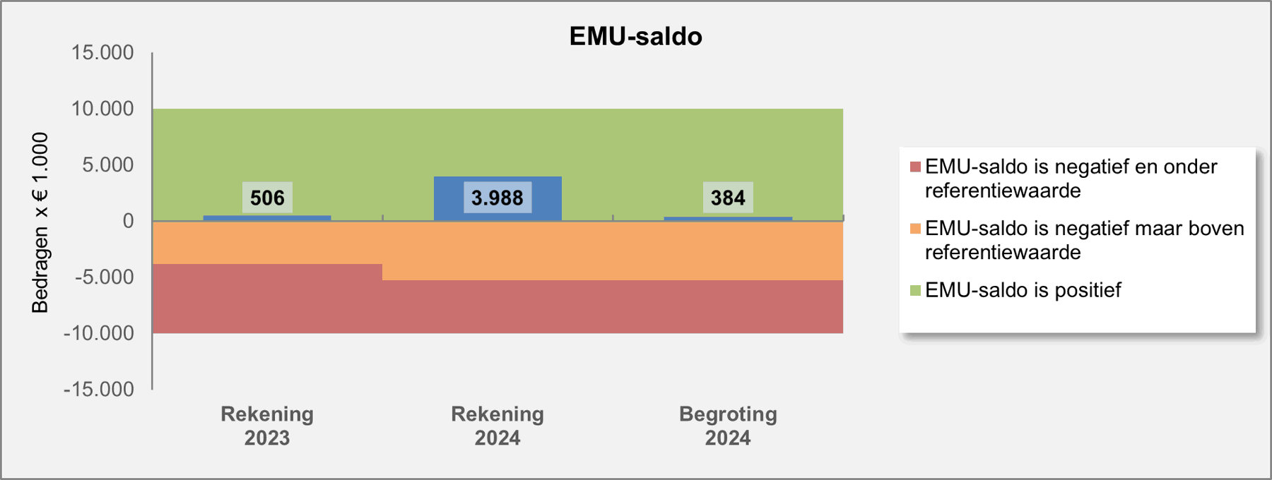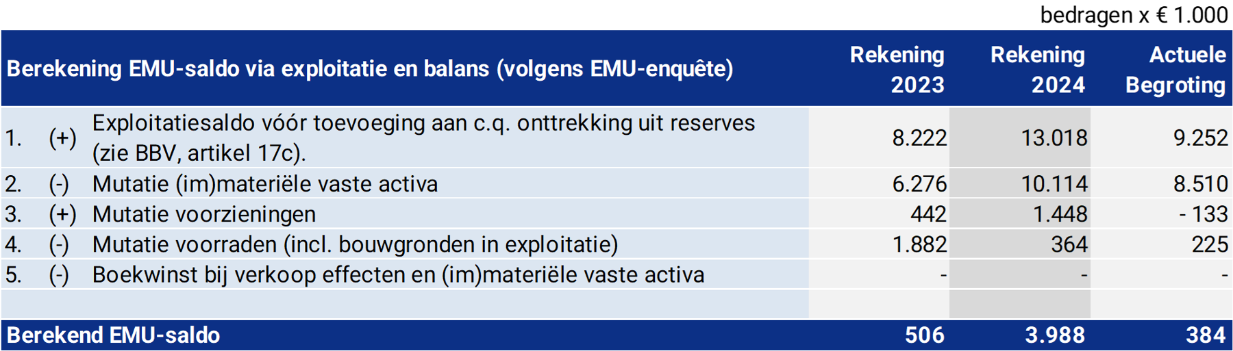 Met ingang van de jaarrekening 2019 dient een overzicht van het EMU-saldo te worden opgenomen. Door de landen binnen de Eurozone zijn afspraken gemaakt hoe groot groot dit saldo mag zijn. Als uitwerking daarvan zijn tussen Rijk, Provincies en Gemeenten nadere afspraken gemaakt over een onderlinge verdeling. Onderstaande tabel laat zien in hoeverre de gemeente Bodegraven-Reeuwijk zich houdt aan deze gemaakte afspraken. Over het jaar 2024 heeft onze gemeente in positieve zin bijgedragen aan het EMU-saldo. Overigens geldt de norm alleen op landelijk niveau en heeft deze norm voor individuele gemeenten slechts een signalerende functie.