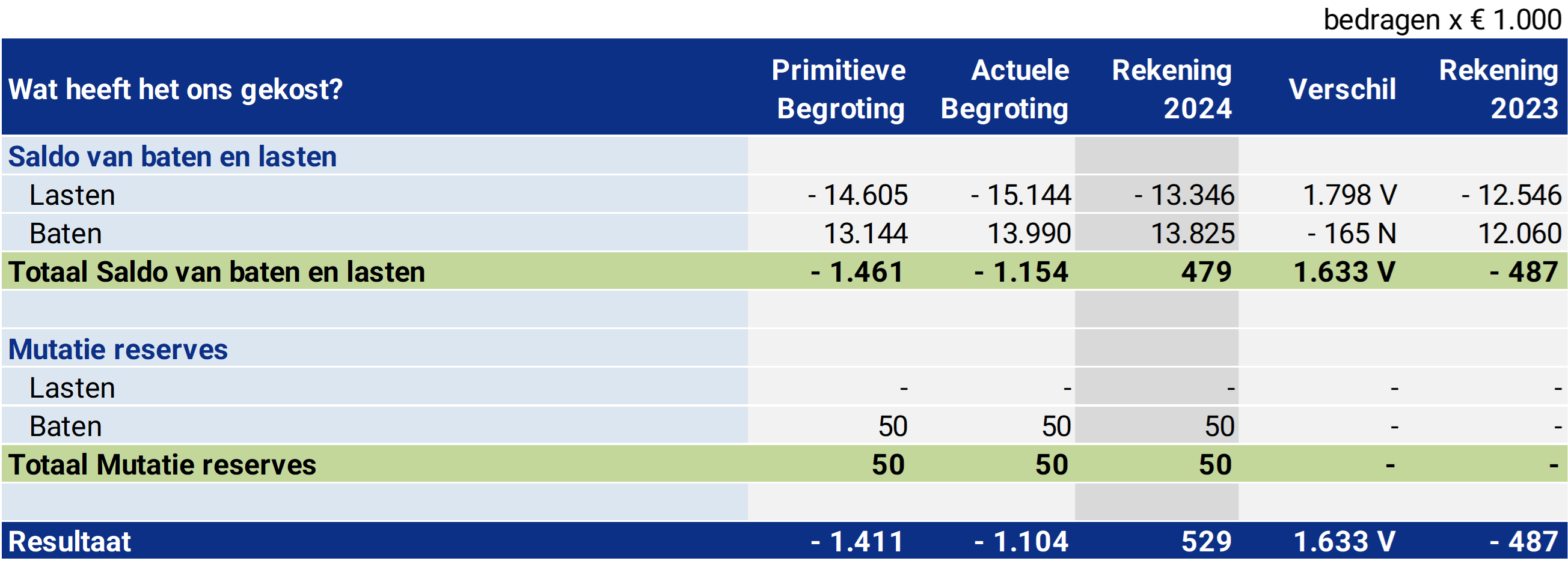 In de dienstverleningsovereenkomst 2024 van Cyclus N.V. was al uitgegaan van de overstap op HVO100 voor de transportmiddelen en als zodanig in de dienstverleningsovereenkomst verwerkt. Dit was in 2024 nog niet gerealiseerd. Hieruit vloeit een voordeel van € 87.000,-. De opbrengsten van papier zijn in 2024 € 43.000,- hoger uitgevallen dan geraamd. In 2024 is nog een voordelige afrekening van Verpact over het jaar 2022 ontvangen van € 35.000,- voor gescheiden ingezamelde, gerecyclede en vermarkte hoeveelheden verpakkingsafval. In 2024 is een extra vergoeding van € 32.000,- ontvangen voor de aanpak van zwerfafval. Tenslotte is er per saldo nog een overig nadeel op afval van € 6.000,- te melden. |