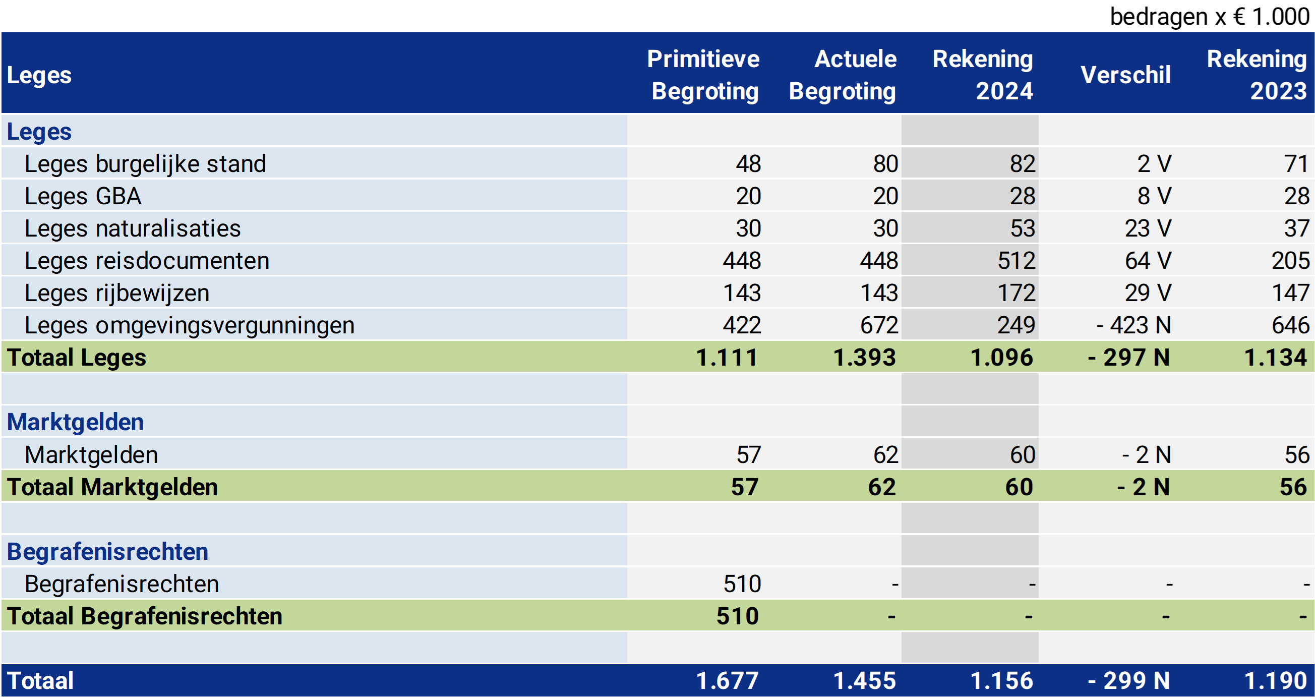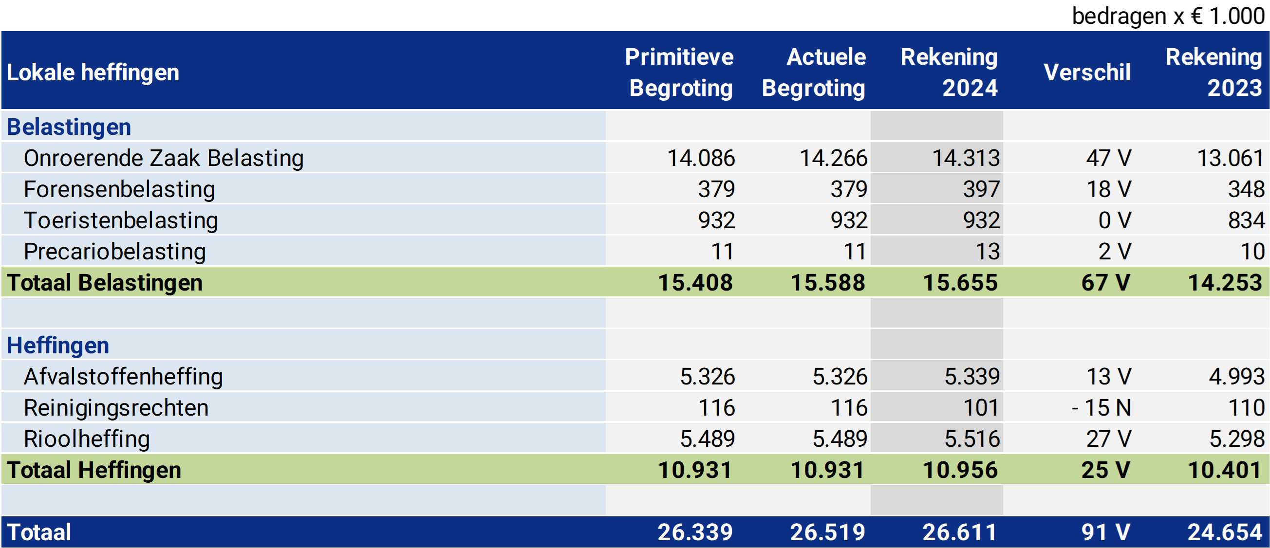 De gemeente kent de volgende gemeentelijke heffingen. In 2024 is iets meer dan het geraamde bedrag ontvangen. Ten opzichte van 2023 is er sprake van een stijging die wordt veroorzaakt door een hogere Onroerende Zaak Belasting en Rioolheffing.