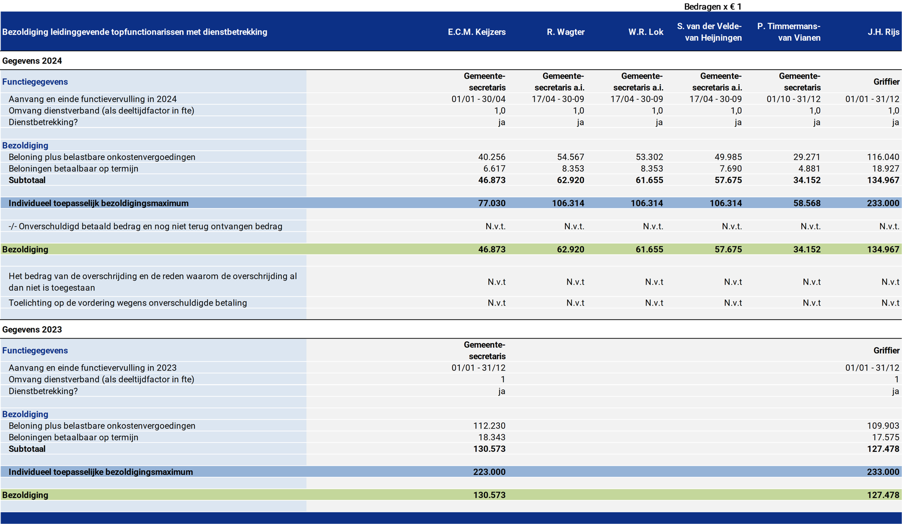 Naast de hierboven vermelde topfunctionarissen zijn er geen overige functionarissen met een dienstbetrekking die in 2024 een bezoldiging boven het individueel toepasselijke drempelbedrag hebben ontvangen.