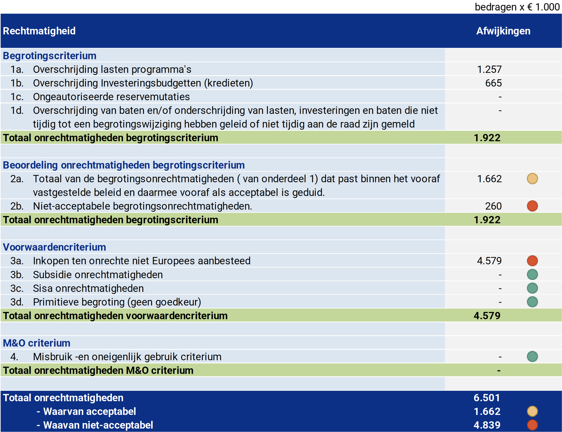 Het college stelt vast dat de omvang van de in deze jaarrekening verantwoorde baten en lasten alsmede de balansmutaties die niet rechtmatig tot stand zijn gekomen bedrag € 6.501.000 bedraagt. Dit is hoger dan de daarvoor gestelde grens van € 2.498.000. Van de niet rechtmatig tot stand gekomen verantwoorde baten en lasten alsmede de balansmutaties is volgens het college overigens een bedrag van € 1.662.000 acceptabel op basis van door de gemeenteraad vastgestelde afspraken.