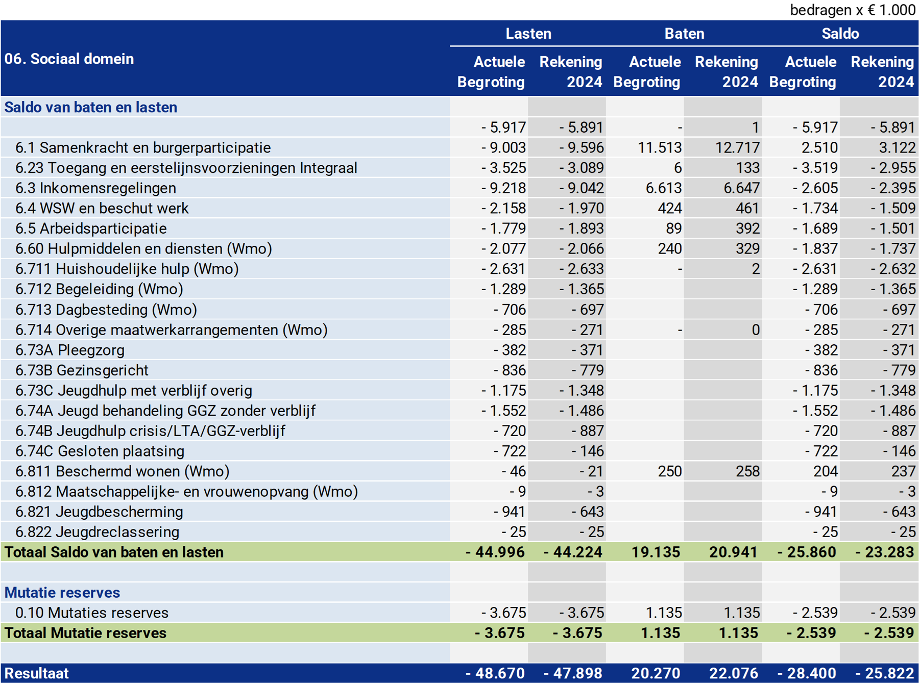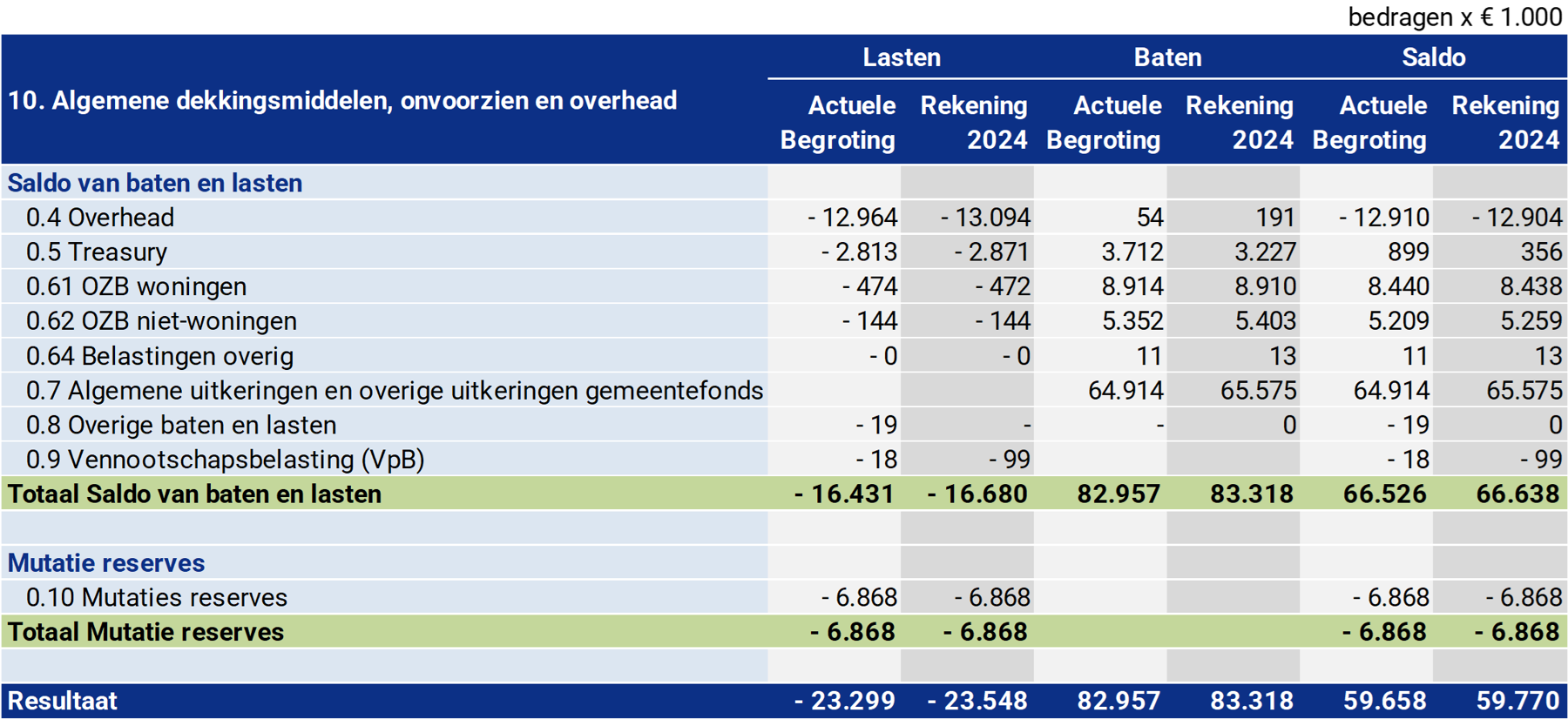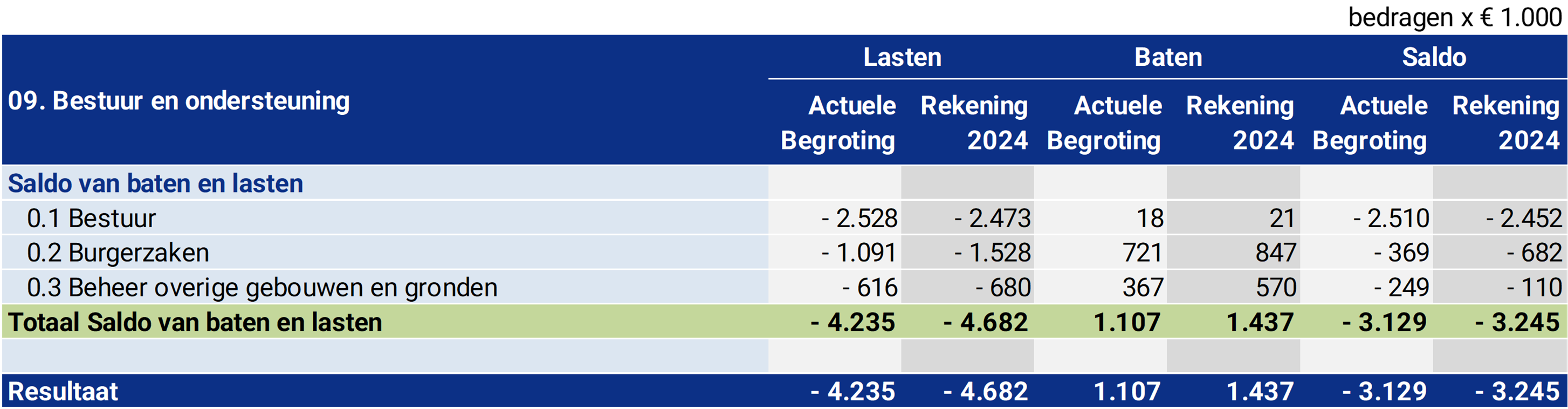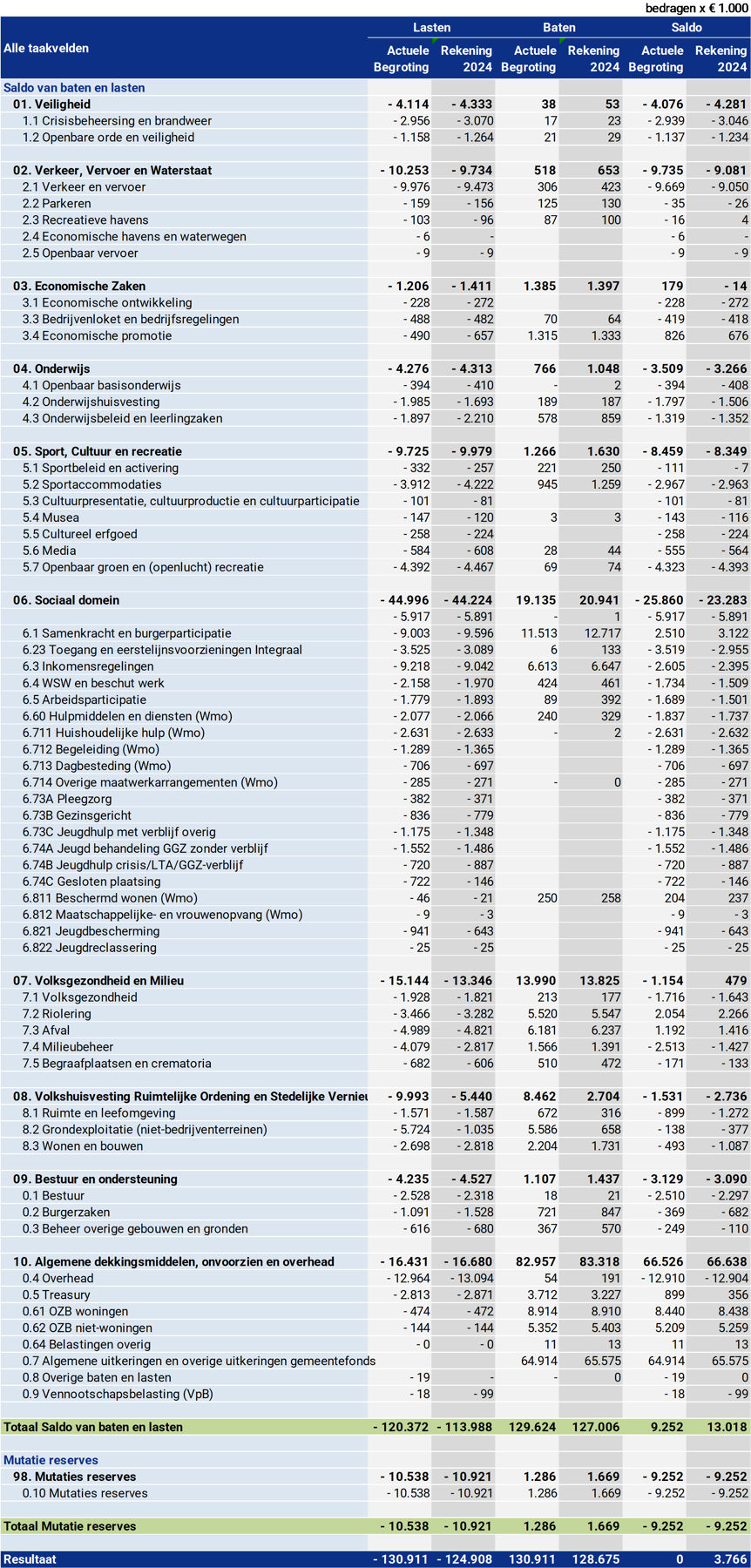 In de hierna volgende tabellen wordt inzicht gegeven is de lasten en baten per taakveld. In eerste aanleg op totaalniveau, vervolgens ook verdeeld over de programma’s.