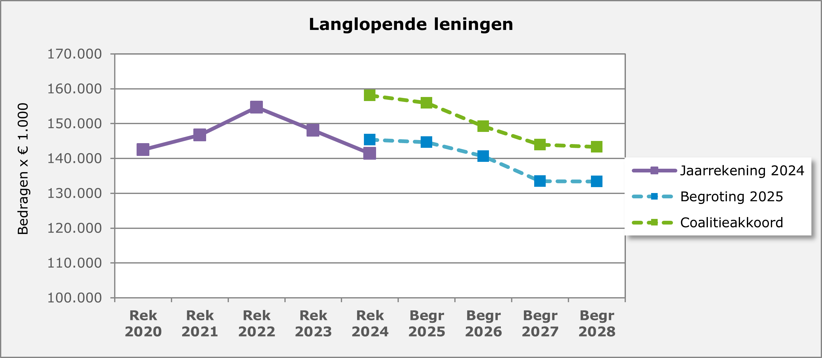 De leningenportefeuille kent per 31 december 2024 een eindstand van € 141 miljoen. Ten opzichte van de stand van 2023 (€ 148 miljoen) is dat een afname van € 7 miljoen. Deze stand is zelfs lager dan bij de laatste begroting (2025) nog werd aangenomen. Toen werd voor 2024 nog het aantrekken van een langlopende lening verwacht van € 4 miljoen. Ten opzichte van het coalitieakkoord is zelfs een verbeterde positie gerealiseerd van bijna € 20 miljoen.