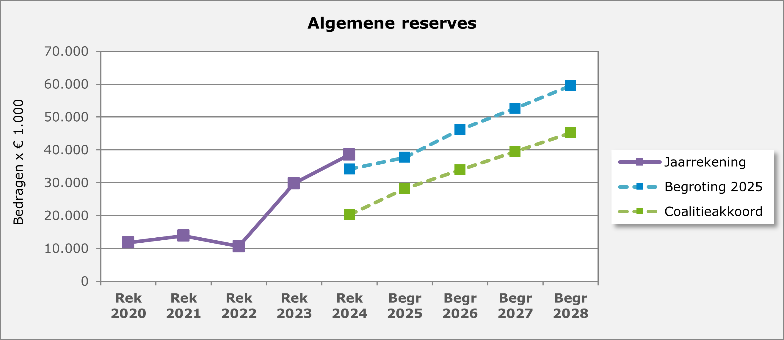 De reservepositie komt, voornamelijk door het batig resultaat van de jaarrekening 2024, zo'n vier miljoen hoger uit. Het verschil tussen de paarse lijn (rekening 2024) en de blauwe stippellijn (begroting 2025) maakt dat inzichtelijk. Ten opzichte van het coalitieakkoord (groene stippellijn) is zelfs sprake van een verdubbeling, namelijk van € 20 naar bijna € 40 miljoen.