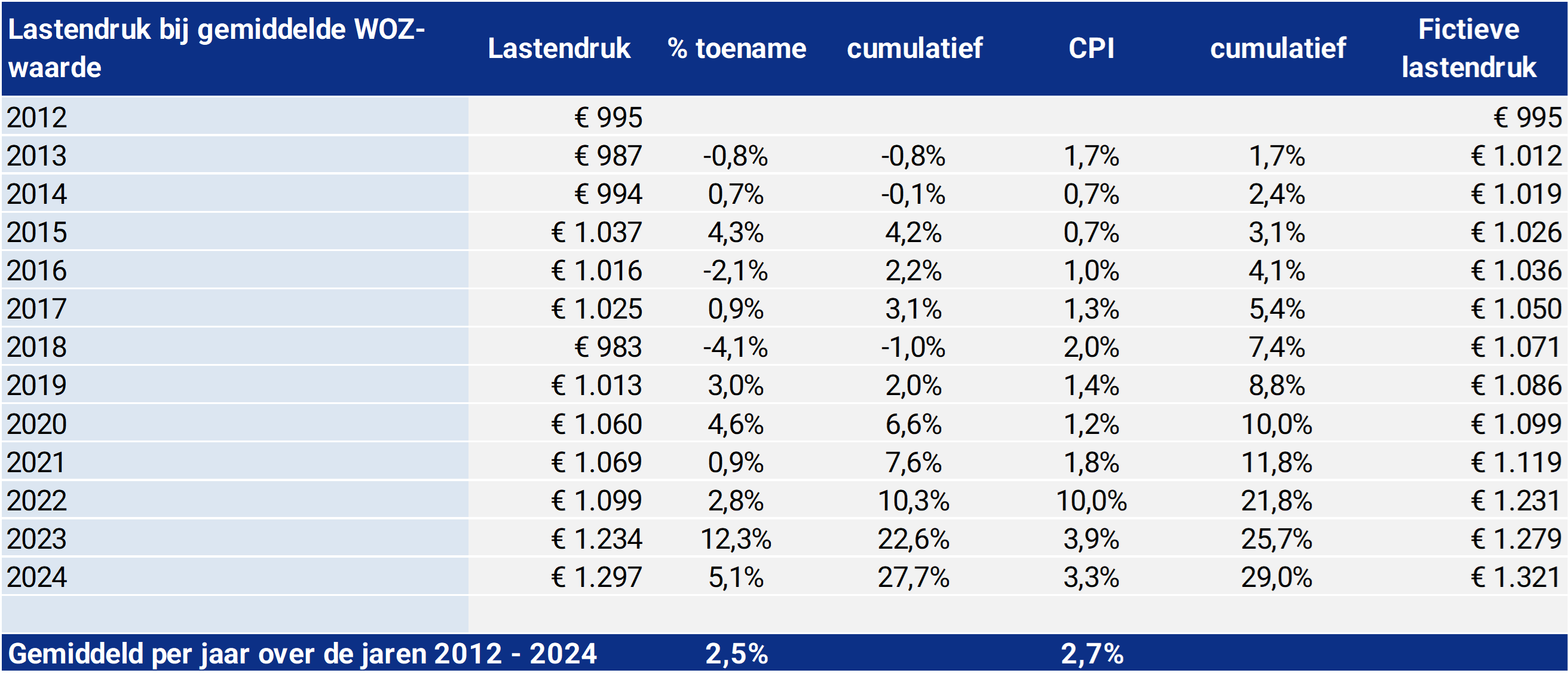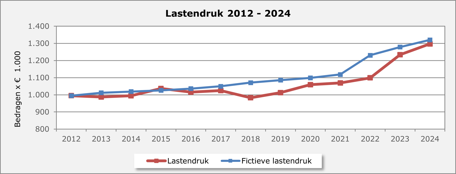 In onderstaande tabel en grafiek is de ontwikkeling van de lastendruk in onze gemeente inzichtelijk gemaakt. De lastendruk is gebaseerd op een meerpersoons huishouden, wonend in een eigen woning met een gemiddelde WOZ-waarde. Deze gemiddelde WOZ-waarde bedroeg in 2024 € 442.000. De gemiddelde lastendruk kwam in 2024 uit op een bedrag van € 1.297 per ‘gemiddeld’ huishouden en is ten opzichte van 2023 met 5,12% gestegen.