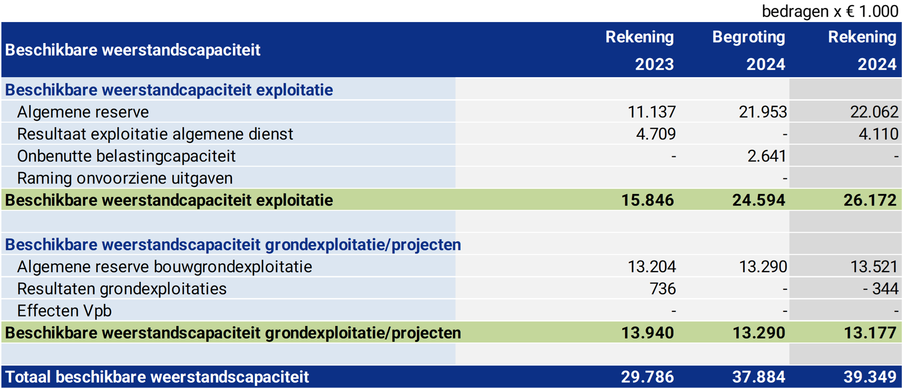 Het eigen vermogen bestaat uit de algemene reserve, bestemmingsreserves en eventuele stille reserves. Voor de beoordeling van het weerstandsvermogen is de stand van de reserves per 31 december 2024 bepalend. Alleen de algemene reserve wordt tot het vrij besteedbaar eigen vermogen gerekend.